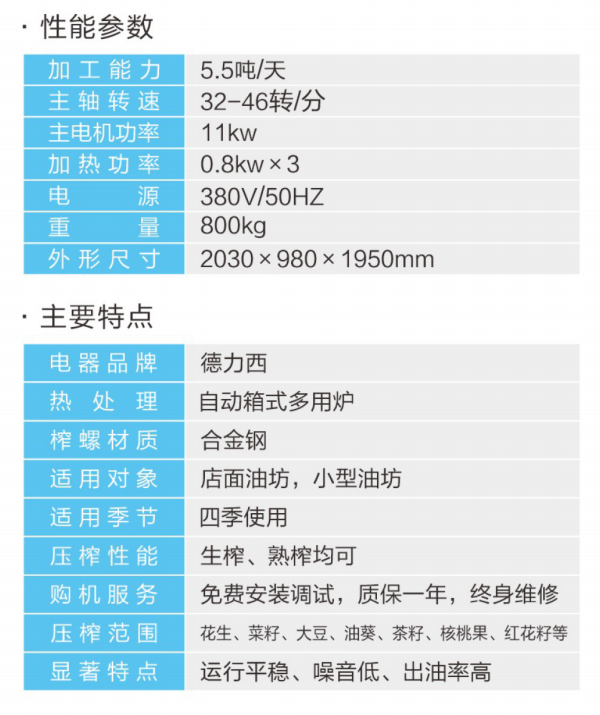 ★壓榨范圍:花生、大豆、菜籽、油葵、茶籽、芝麻等;★適用對象:店面油坊和微小油坊;★壓榨性能:熱榨一次榨盡,免費(fèi)安裝調(diào)試