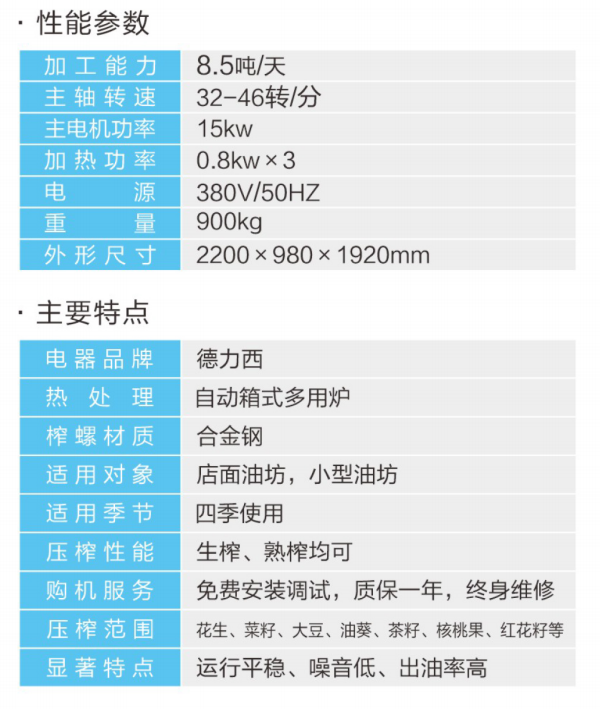 ★壓榨范圍:花生、大豆、菜籽、油葵、茶籽、芝麻等;★適用對(duì)象:店面油坊和微小油坊;★壓榨性能:熱榨一次榨盡,免費(fèi)安裝調(diào)試